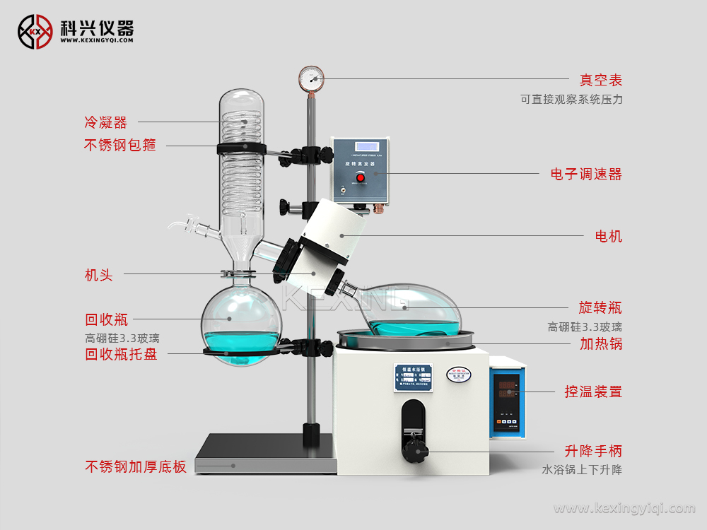 旋转蒸发仪主要用于医药、化工和生物制药等行业的浓缩、结晶、干燥、分离及溶媒回收。其原理为在真空条件下,恒温加热,使旋转瓶恒速旋转,物料在瓶壁形成大面积薄膜,高效蒸发。溶媒蒸气经高效玻璃冷凝器冷却,回收于收集瓶中,大大提高蒸发效率。特别适用对高温容易分解变性的生物制品的浓缩提纯。产品可与循环水式多用真空泵、隔膜真空泵、低温循环(真空)泵,循环冷却器,恒温循环器,低温冷却液循环泵等配套组成系统装置。